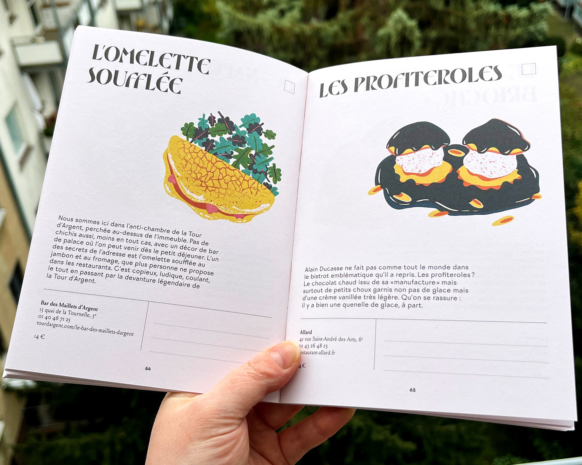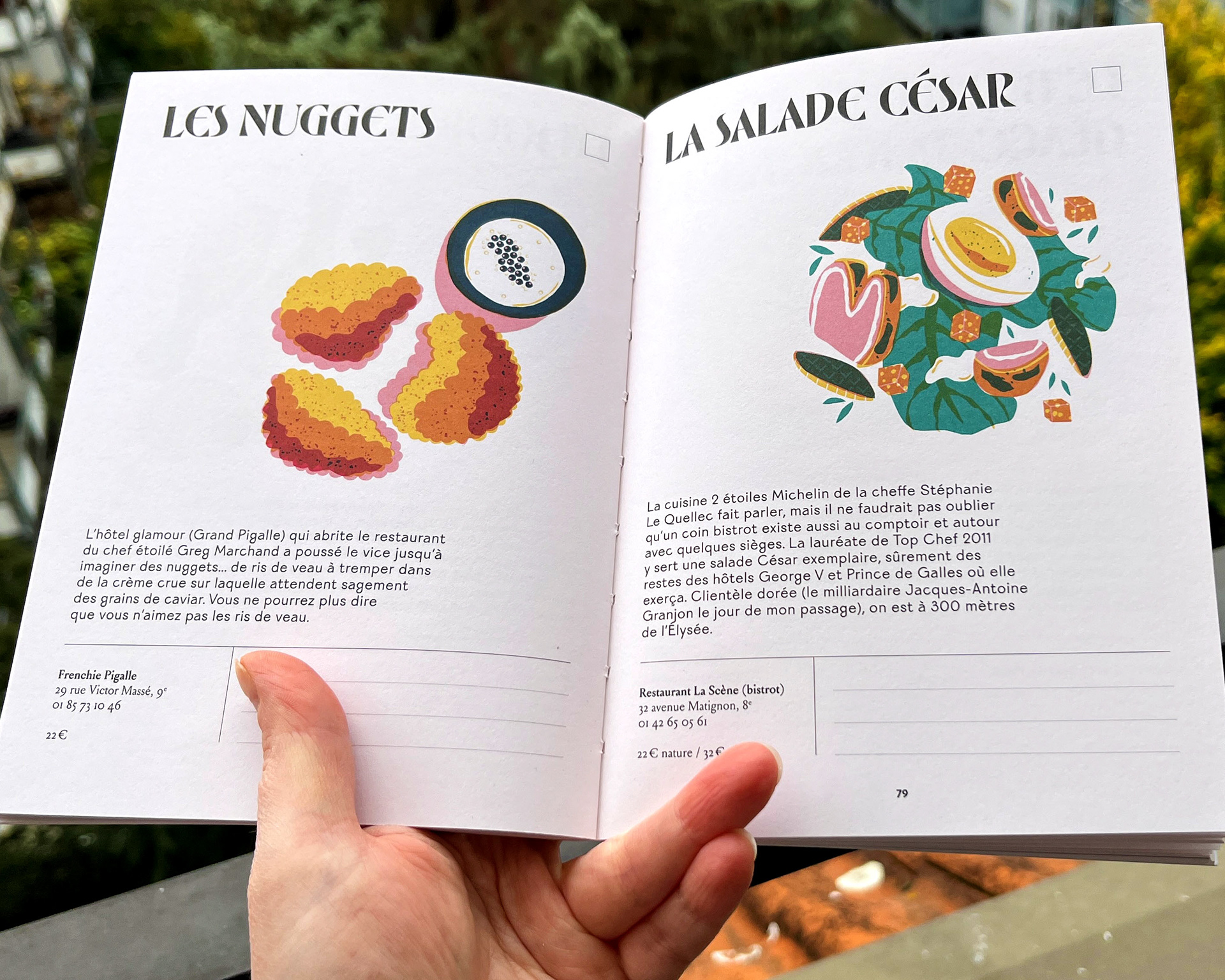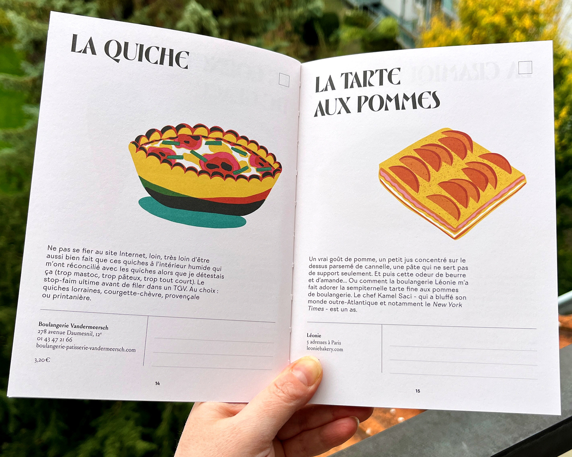 99 small illustrations for a printed Food Guide with the best 99 savory dishes, pastries, beverages and confections in Paris. Re-printed by Flammarion