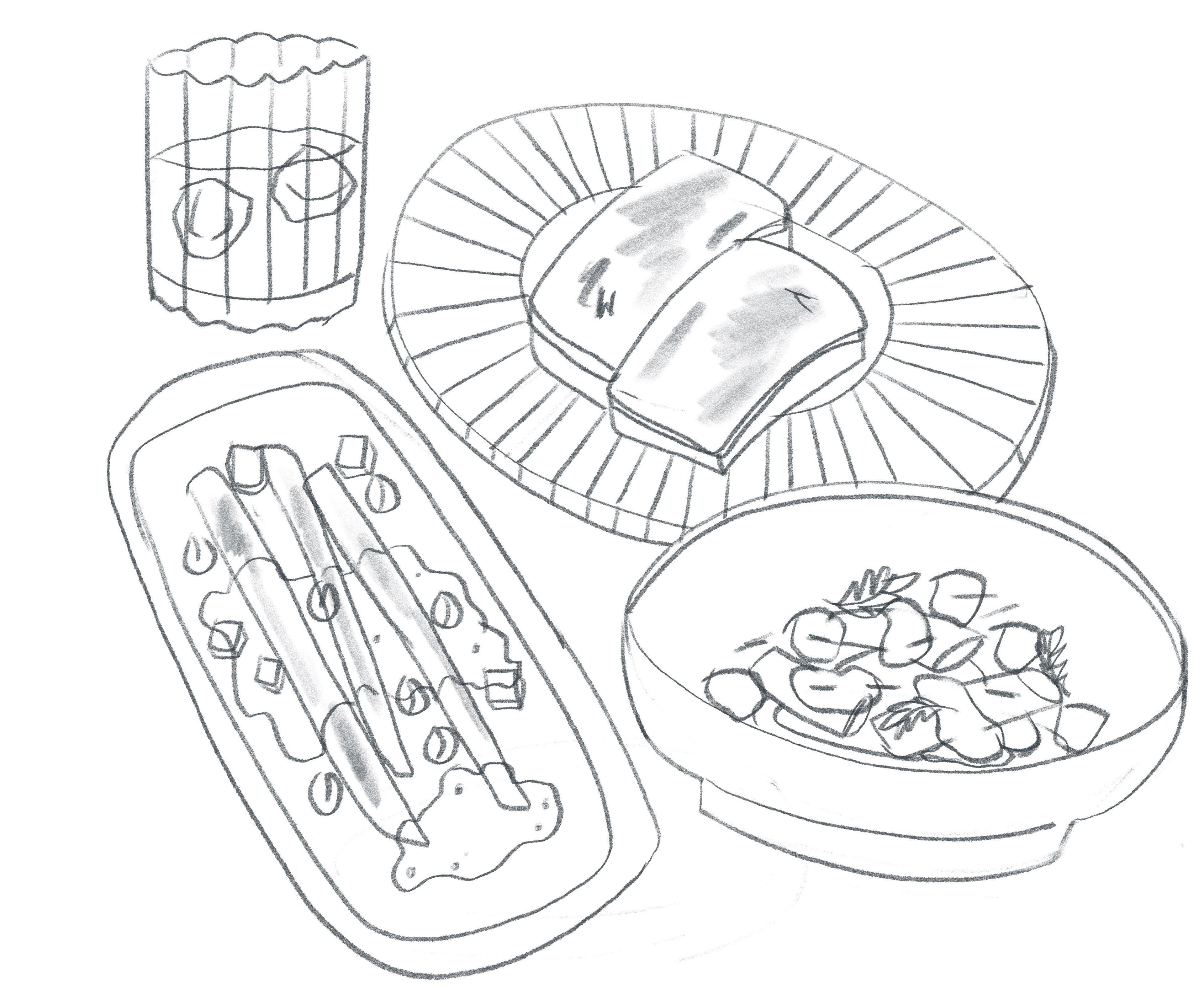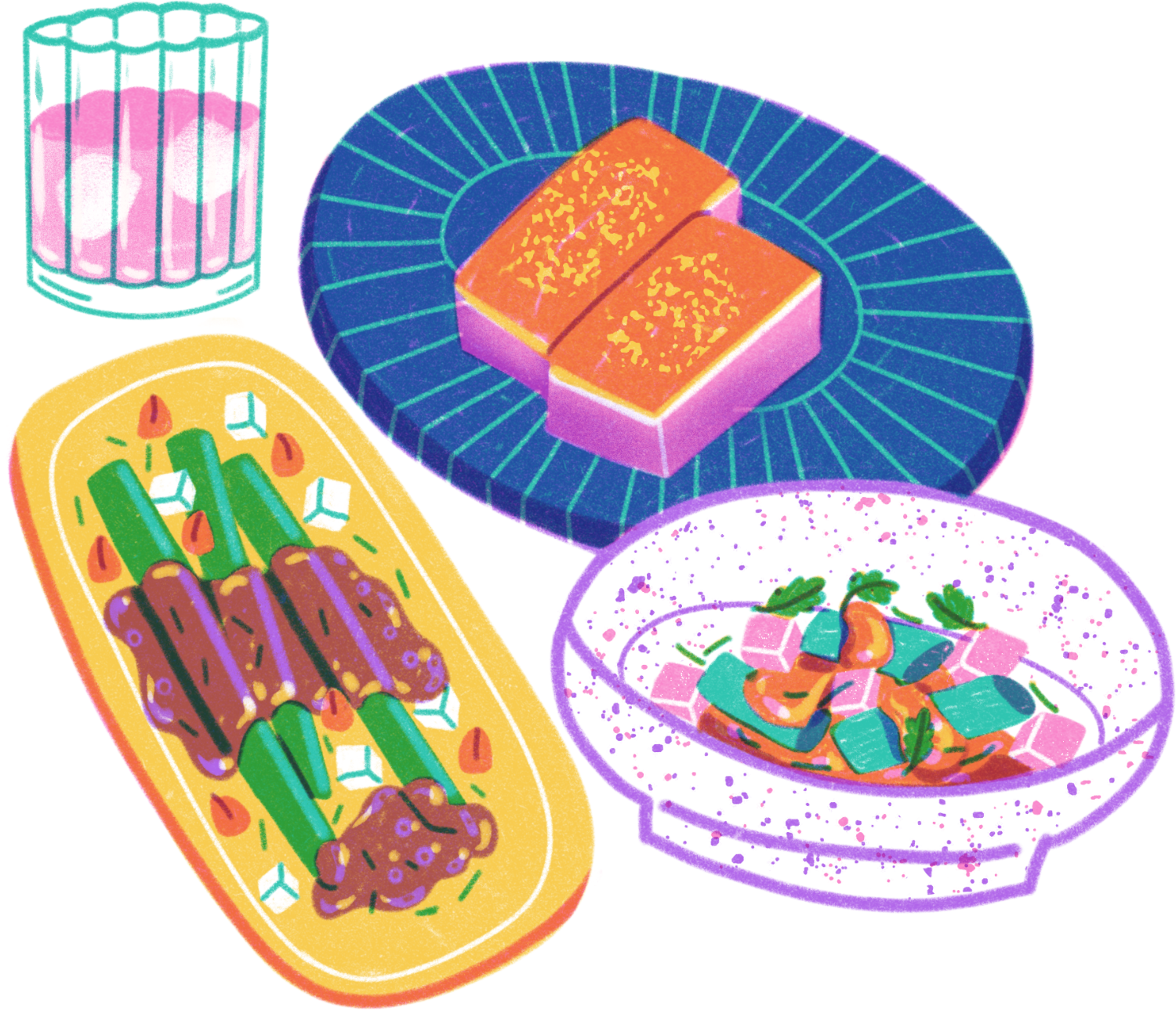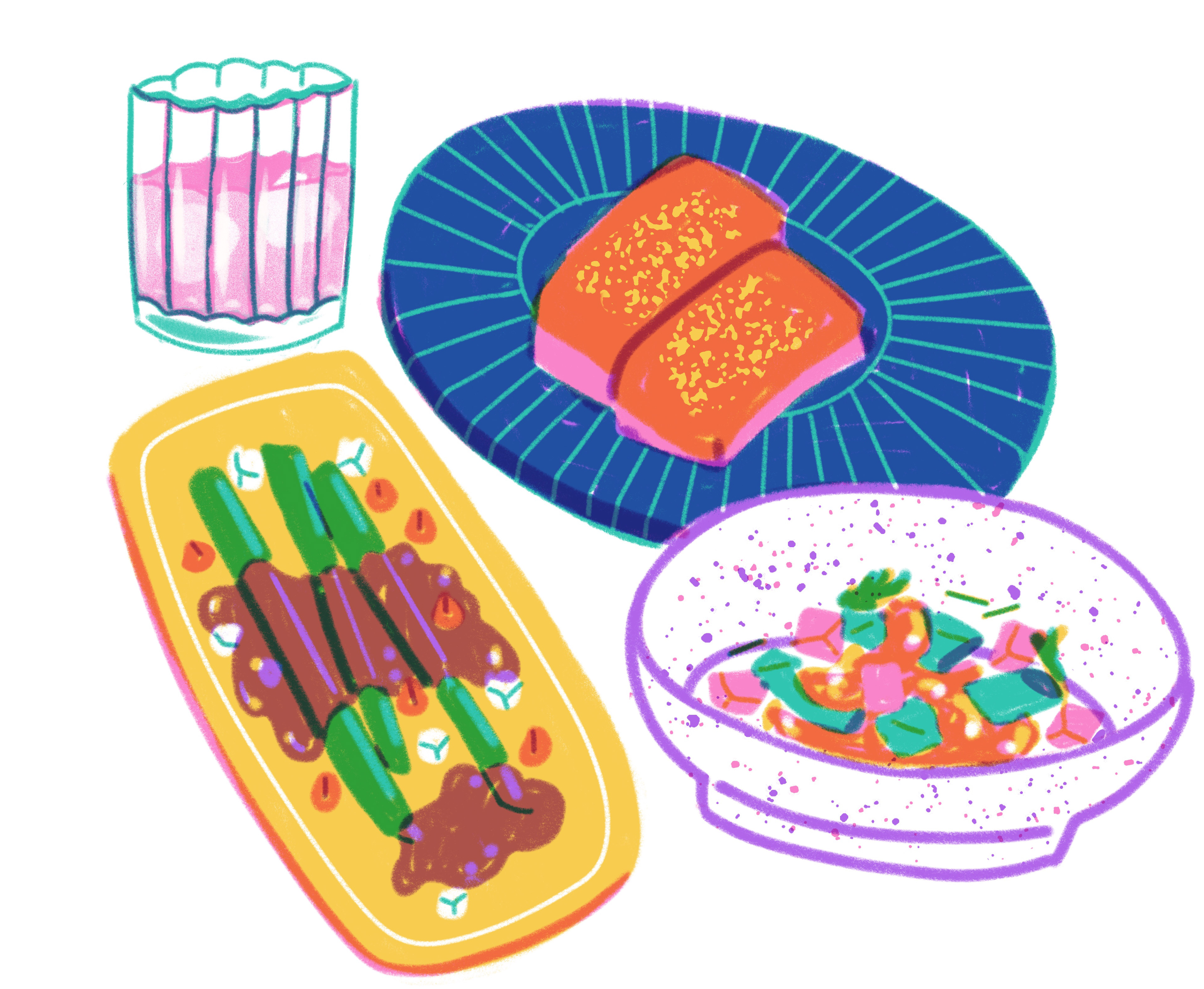 Spot illustrations for Esses Magazine, accompanying Kate Reid's Eating Guide to Melbourne. Each piece captures the character of the city's dining scene through loose shapes and a warm, editorial palette.